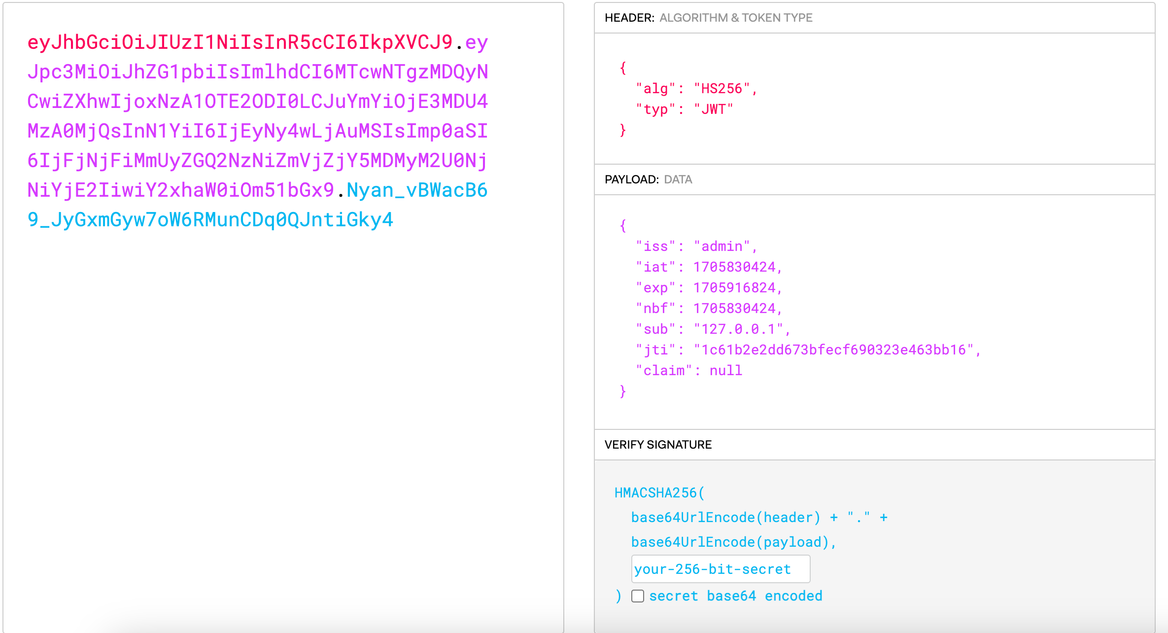 - exp: indicates the expiration time, the current time plus 24 hours.