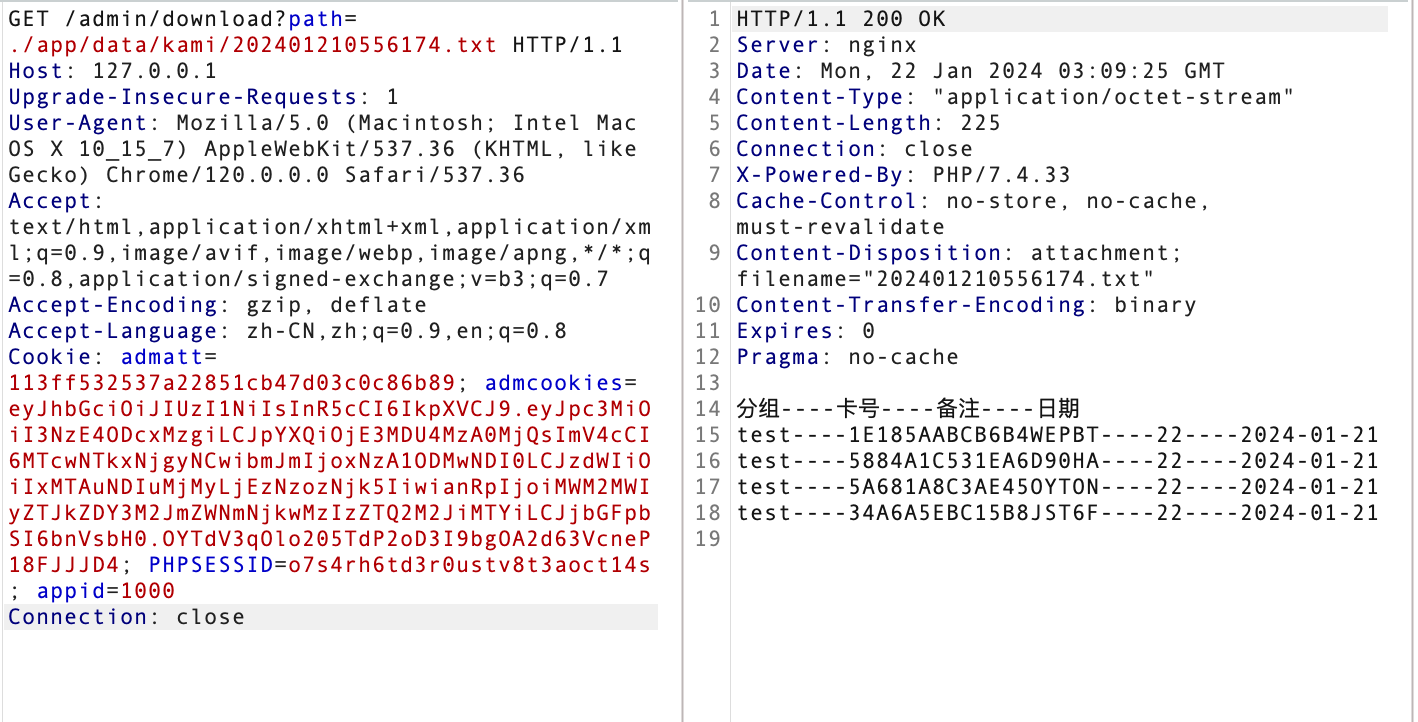 http://127.0.0.1/admin/download?path=./app/data/kami/202401210556174.txt