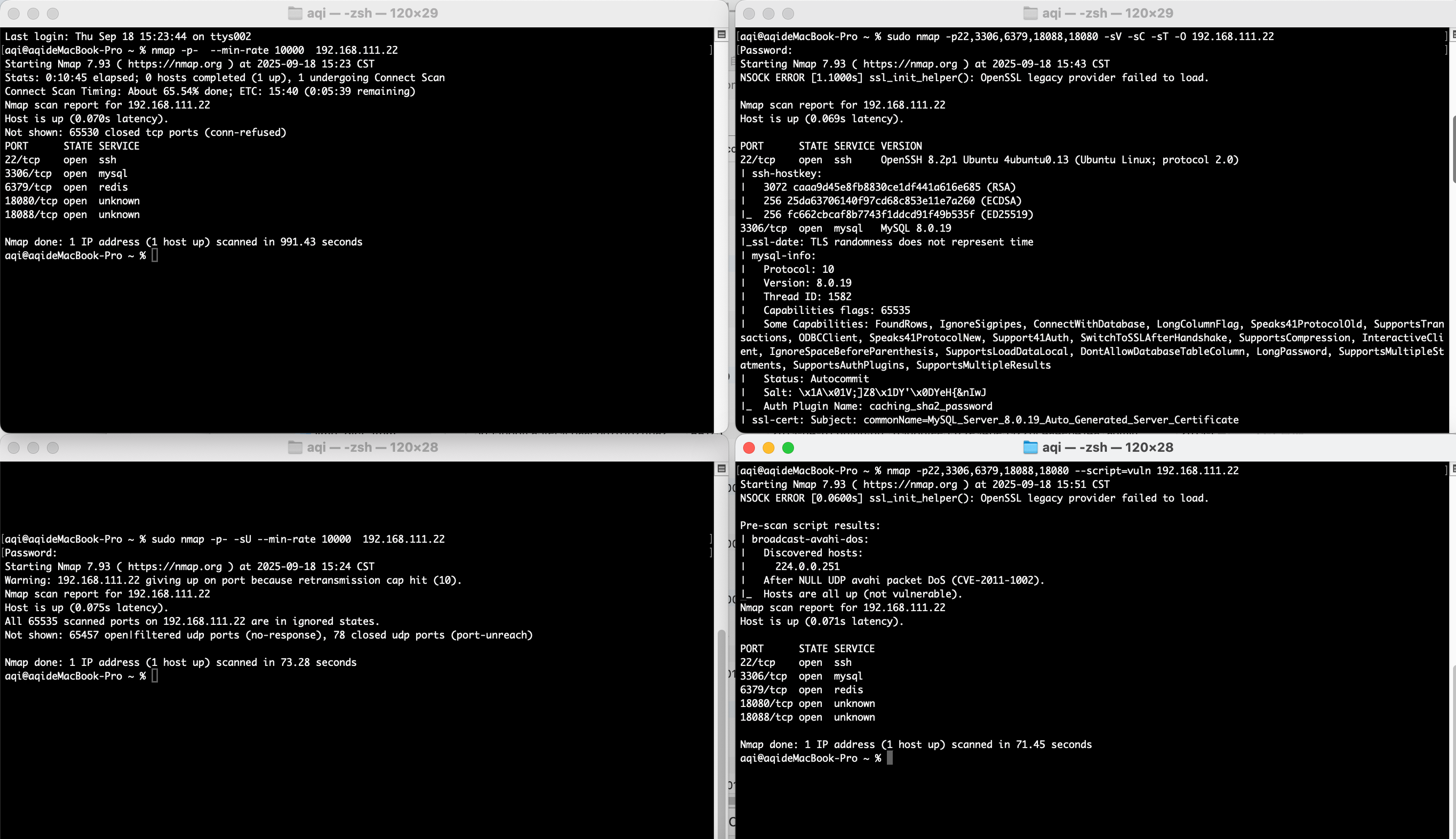 nmap -p- --min-rate 10000 192.168.111.22 nmap -p- -sU --min-rate 10000 192.168.111.22 nmap -p22,3306,6379,18088,18080 --script=vuln 192.168.111.22 nmap -p22,3306,6379,18088,18080 -sV -sC -sT -O 192.168.111.22