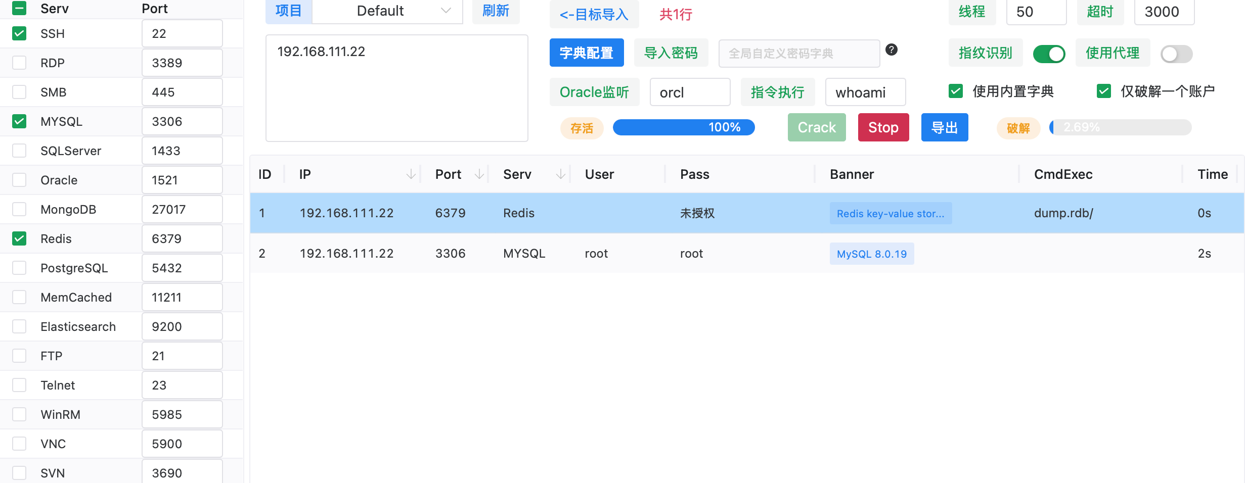 爆破 SSH(22)、MySQL(3306)、Redis(6379)