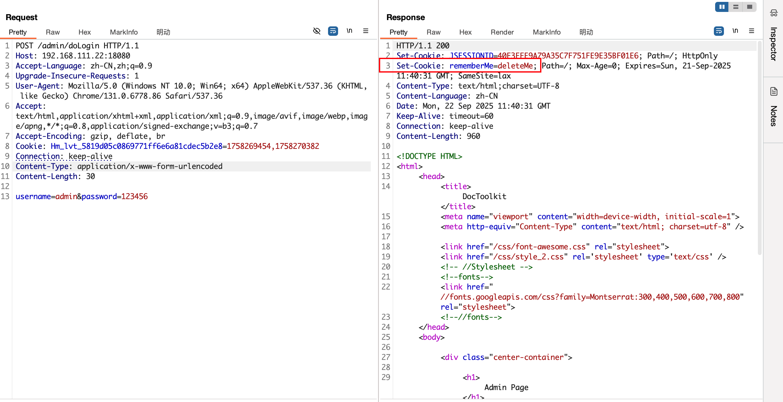| POST /admin/doLogin HTTP/1.1 Host: 192.168.111.22:18080 Accept-Language: zh-CN,zh;q=0.9 Upgrade-Insecure-Requests: 1 User-Agent: Mozilla/5.0 (Windows NT 10.0; Win64; x64) AppleWebKit/537.36 (KHTML, like Gecko) Chrome/131.0.6778.86 Safari/537.36 Accept: text/html,application/xhtml+xml,application/xml;q=0.9,image/avif,image/webp,image/apng,*/*;q=0.8,application/signed-exchange;v=b3;q=0.7 Accept-Encoding: gzip, deflate, br Cookie: Hm_lvt_5819d05c0869771ff6e6a81cdec5b2e8=1758269454,1758270382 Connection: keep-alive Content-Type: application/x-www-form-urlencoded Content-Length: 30