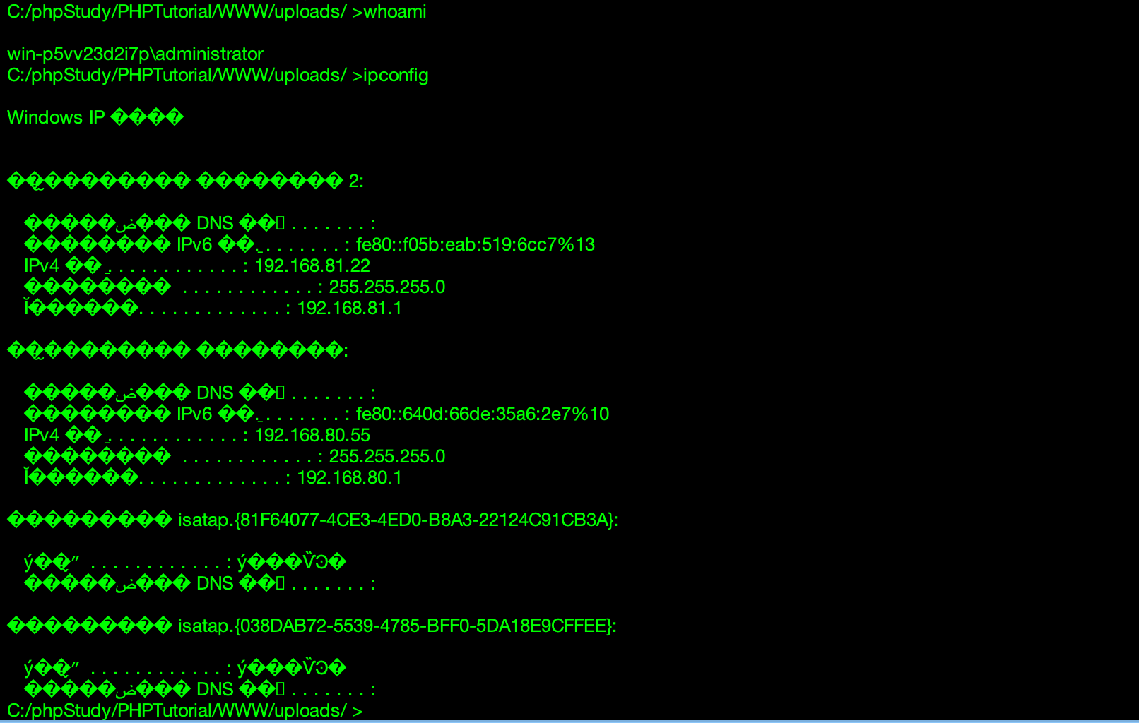 win-p5vv23d2i7p\administrator C:/phpStudy/PHPTutorial/WWW/uploads/ >ipconfig