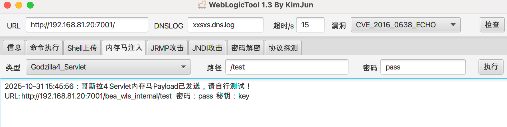 http://192.168.81.20:7001/bea_wls_internal/test 密码:pass 秘钥:key